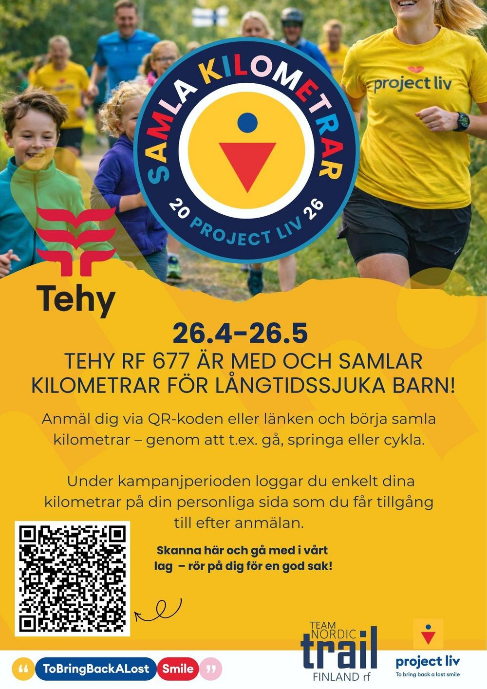 Tehy 677 deltar i årets Samla kilometrar–kampanj som ordnas av Project Liv. Kampanjen pågår 26.4–26.5.2026, och alla som vill är varmt välkomna att vara med i vårt lag.